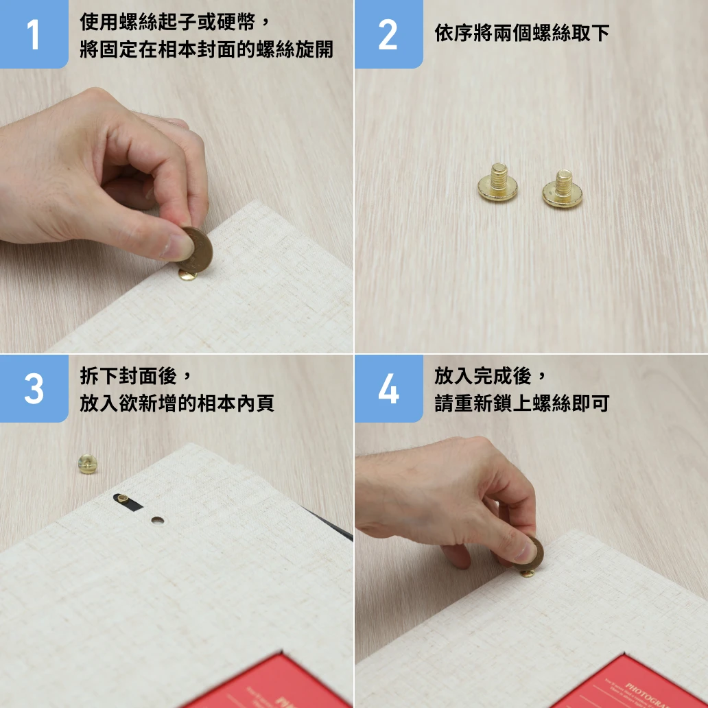使用螺絲固定,輕鬆整理相片排序,隨著孩子成長或時間推移,靈活紀錄生活點滴。